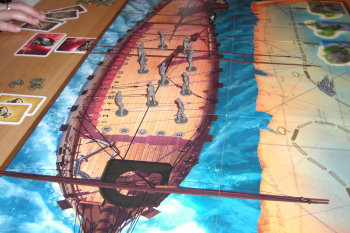 Der Spielplan ist in zwei Bereiche unterteilt. Die eine Seite zeigt das Piratenschiff, auf welchem später die Meuterei stattfinden wird. Die